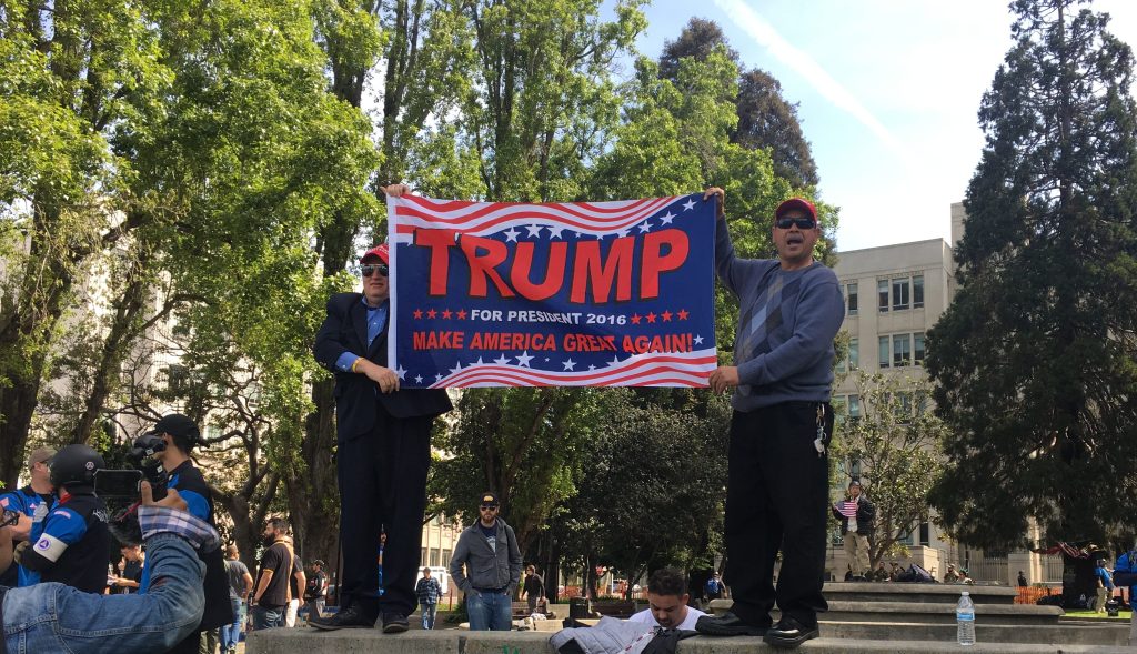 The rally was held at Martin Luther King Jr. Civic Center Park, and began with free speech and Trump supporters facing off against anti-Trump supporters and “anti-fascist” protesters. Berkeley police acted as a human barrier between both sides, but that did little to keep them apart. Anti-fascist protesters marched into the park chanting while Trump supporters donned in army gear and helmets took their stance in the park.