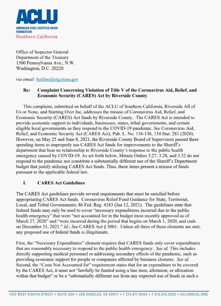 Starting Over, ACLU of Southern California and AOUON submitted a joint complaint last July, citing misuse of funds from the federal Coronavirus Aid, Relief, and Economic Security (CARES) Act. The funds were designated for programs specifically addressing the COVID-19 pandemic, but the complaint alleges millions of dollars given to Riverside County went to the Riverside Sheriff’s Department.