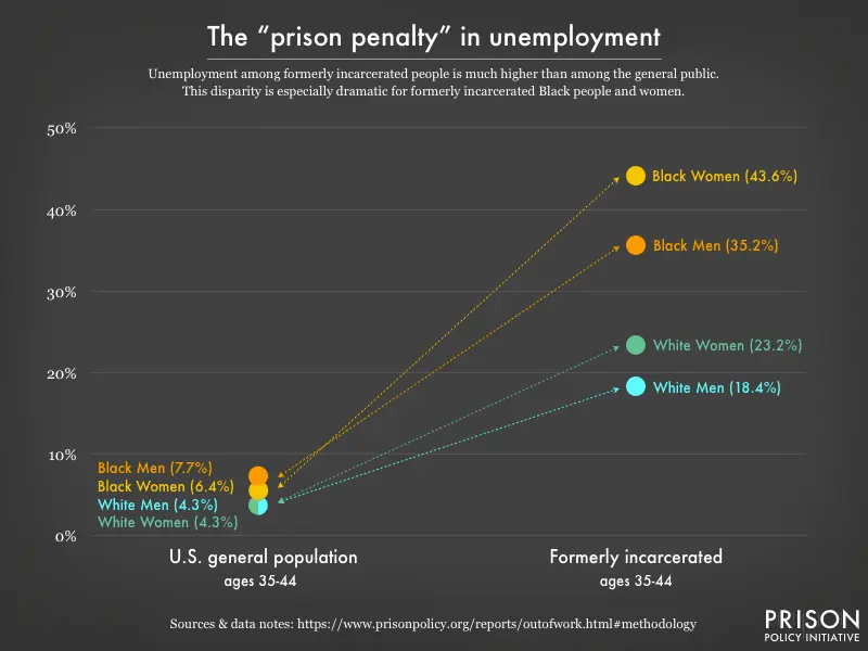 “Our estimate of the unemployment rate establishes that formerly incarcerated people want to work, but face structural barriers to securing employment, particularly within the period immediately following release,” according to the Prison Policy Institute’s research. For those who are Black or Hispanic — especially women — their status as “formerly incarcerated” reduces their employment chances even more. The difficulty formerly imprisoned people have finding stable jobs and housing can be attributed to the stigma they experience related to a prison conviction.