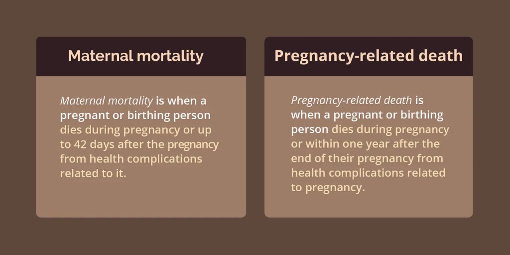 Maternal mortality is when a pregnant or birthing person dies during pregnancy or up to 42 days after the pregnancy from health complications related to it. Pregnancy-related death is when a pregnant or birthing person dies during pregnancy or within one year after the end of their pregnancy from health complications related to pregnancy.