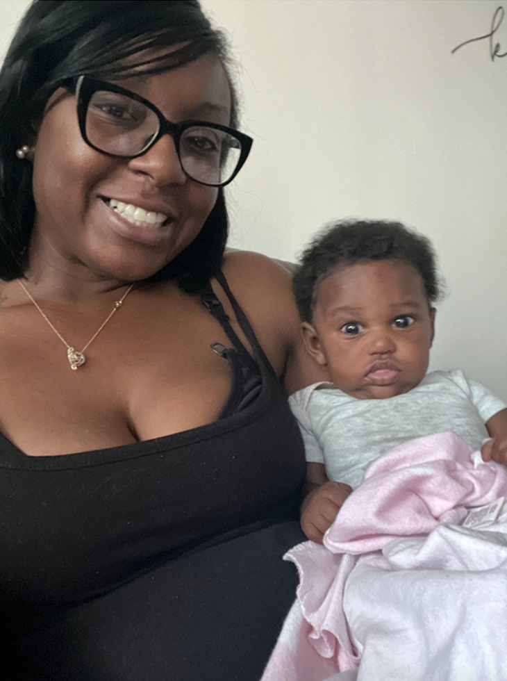 Left: DeShawna “Shay” Wright, a hairstylist in San Bernardino county, gave birth to her daughter Noni in February 2022 with the support of a doula. Right: Noni, Wright’s daughter, grins as her mother takes her picture (Images courtesy of DeShawna Wright).