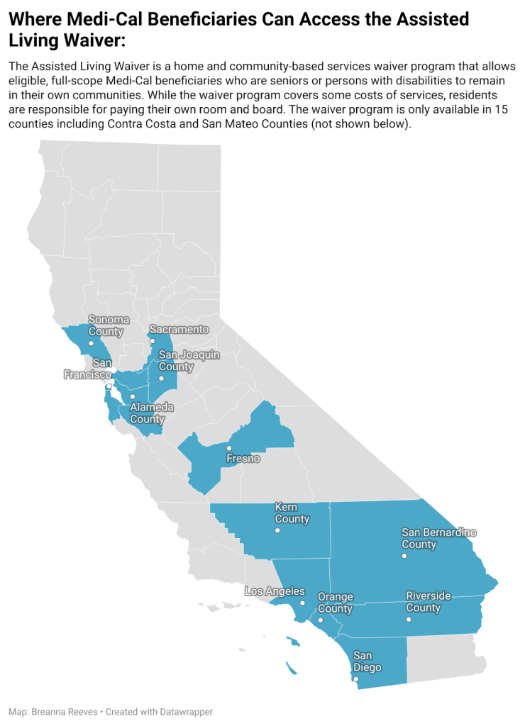 Under Medi-Cal, there are some waiver programs that will shoulder some of the costs of home and community-based services like assisted living. Eligible adults can apply for the Medi-Cal Assisted Living Waiver, but must be able to pay for the cost of personal and additional needs. Those who are granted the waiver are reimbursed by Medi-Cal for services provided to residents. The waiver is only available in 15 of California’s 52 counties.
