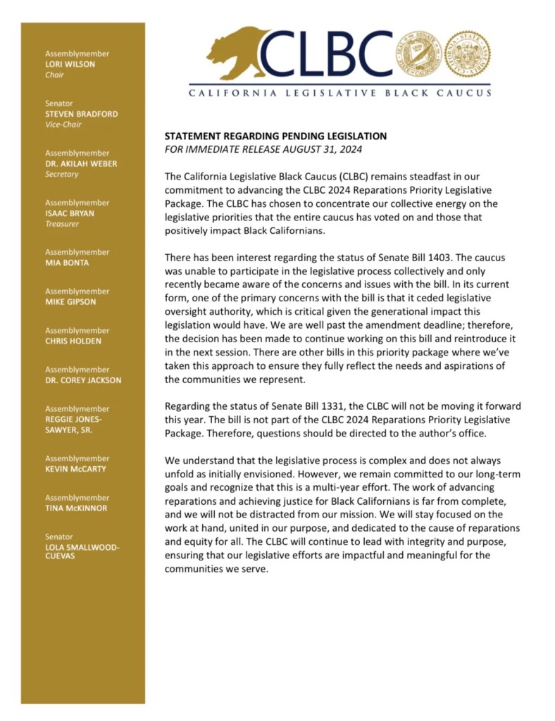 “As Chair of the California Reparations Task Force, I am deeply dismayed by the actions of Governor Newsom’s administration and the California Legislative Black Caucus (CLBC),” Moore posted on X on Oct. 3 as the press conference proceeded. “It is essential that SB 1403, SB 1331 and other material reparations bills specifically for descendants be reintroduced and passed into law, as these measures are critical to advancing reparations.”